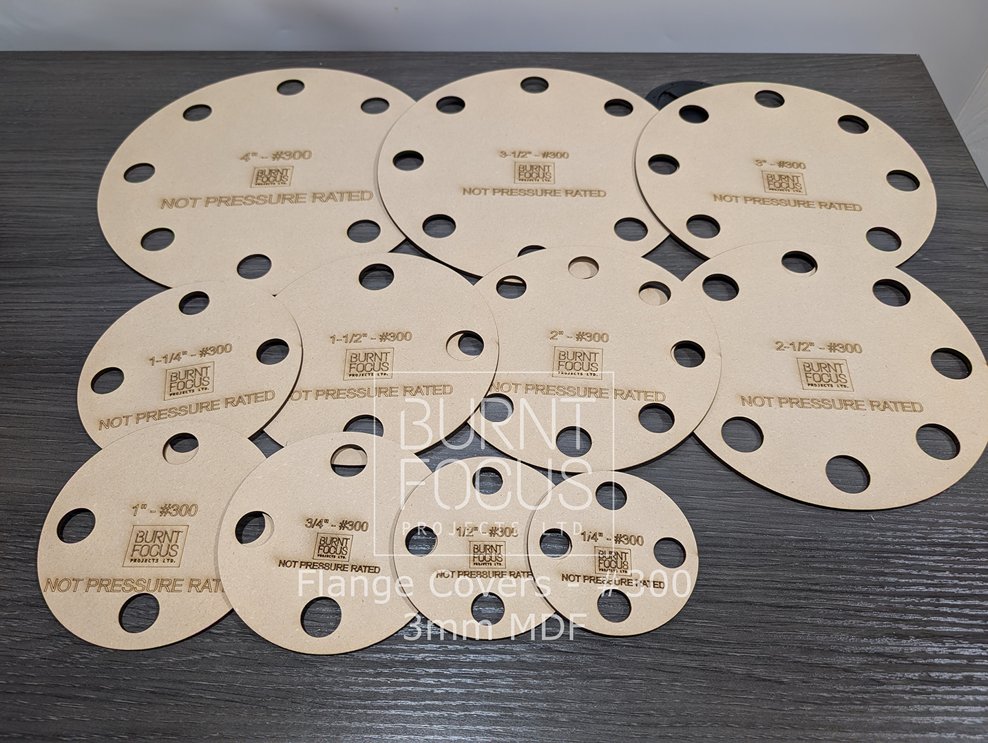 Protect your customers’ assets by using our reusable laser cut 1/8″ (3mm) unfinished MDF flange covers sized for Class 300 flanges. We regularly stock covers for most sizes from 1/4″ through 14″.